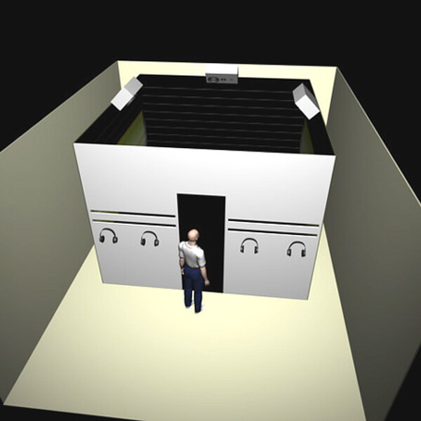 The DIS<_>HARMONISER environment turns real space into a movement-sensitive audio-visual laboratory, a quest for the perfect (dis)harmony of image and sound in accessible space. The environment is a closed space with three connected screens, each of which has its acoustic source. Outside the box, four visitors can observe the recipient during his or her quest for harmony: equipped with headphones, they are put into the position to follow the goings on through a peephole. The recipient is guided through different scenarios which he or she can play similar to instruments. As soon as the observer starts to move in the space, the acoustic world and the visual world will follow his or her movements. The respective scenario is to be investigated without any didactic introduction; mere intention creates perfect harmony and makes it perceptible. Animations and sounds can be exchanged within the individual scenarios thus creating unlimited possibilities of combination and intensifying the experience.