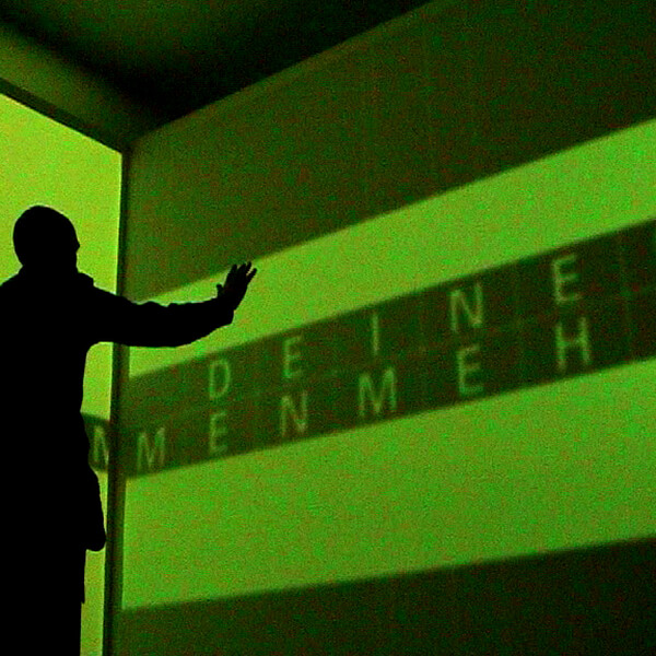 The recipient's position is determined by the motion-detection software EyeCon. Functionalities (film segmentation, speed shifting etc.) are transferred to film in real-time by means of the quick time-authoring software of HUMATIC¨ Berlin. These films are projected onto three independently functioning screens. The result is a space illusion fathoming the recipient's focus. It is also possible to generate segments sensitive to dynamics or continuously variable coordinates and those can also be connected to each other.